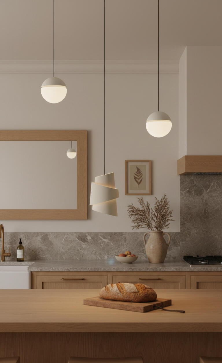 A two‑height lighting composition that brings balance, warmth, and grounded beauty across the room.